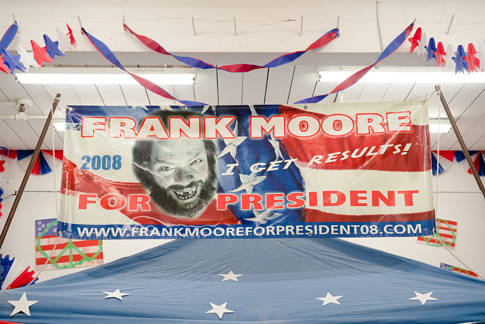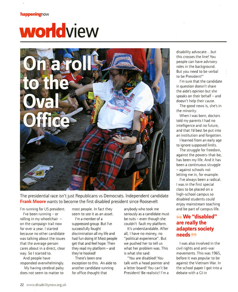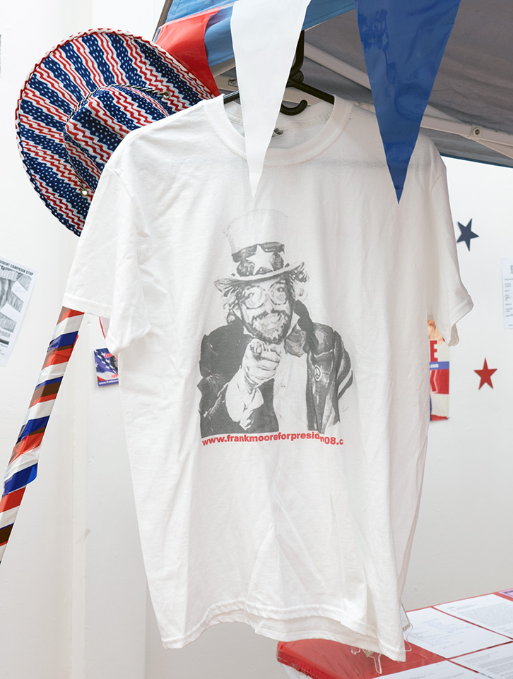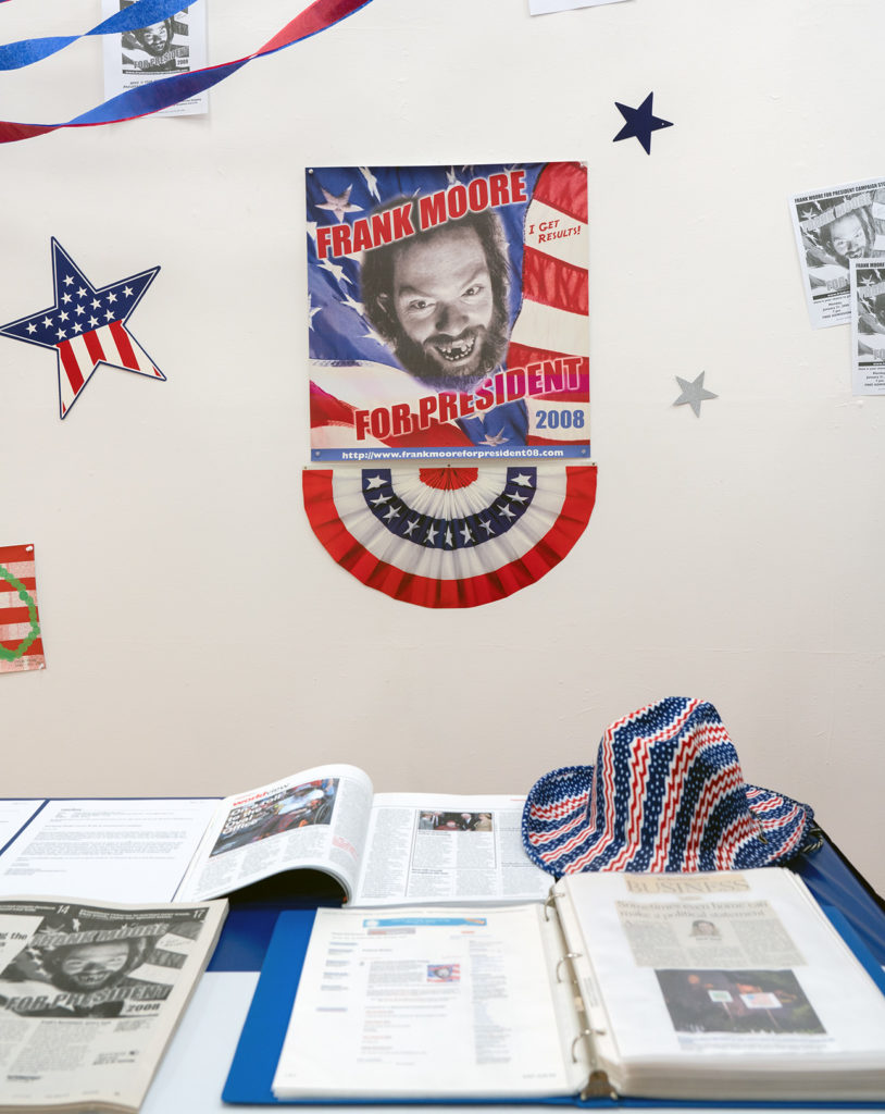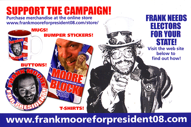 Frank Moore (1946–2013) was an artist, poet, painter, shaman, and teacher based in Berkeley, California. In 2008, and alongside running mate Susan Block, a sex educator and author, he mounted a campaign for president of the United States of America. A political novice who used a wheelchair and communicated primarily through a head-pointer, Moore intrinsically challenged norms of appearance, ability, and communication simply by way of showing up.
