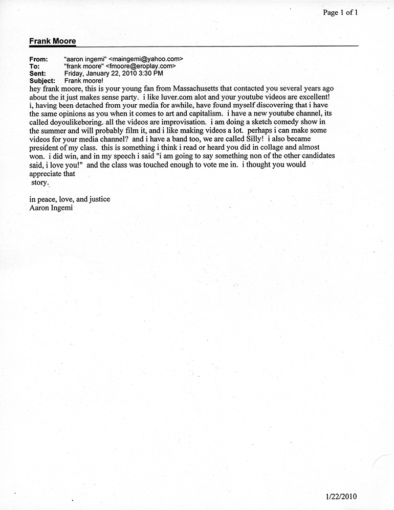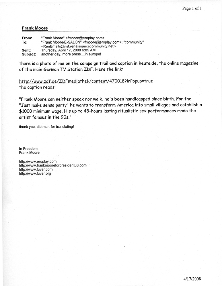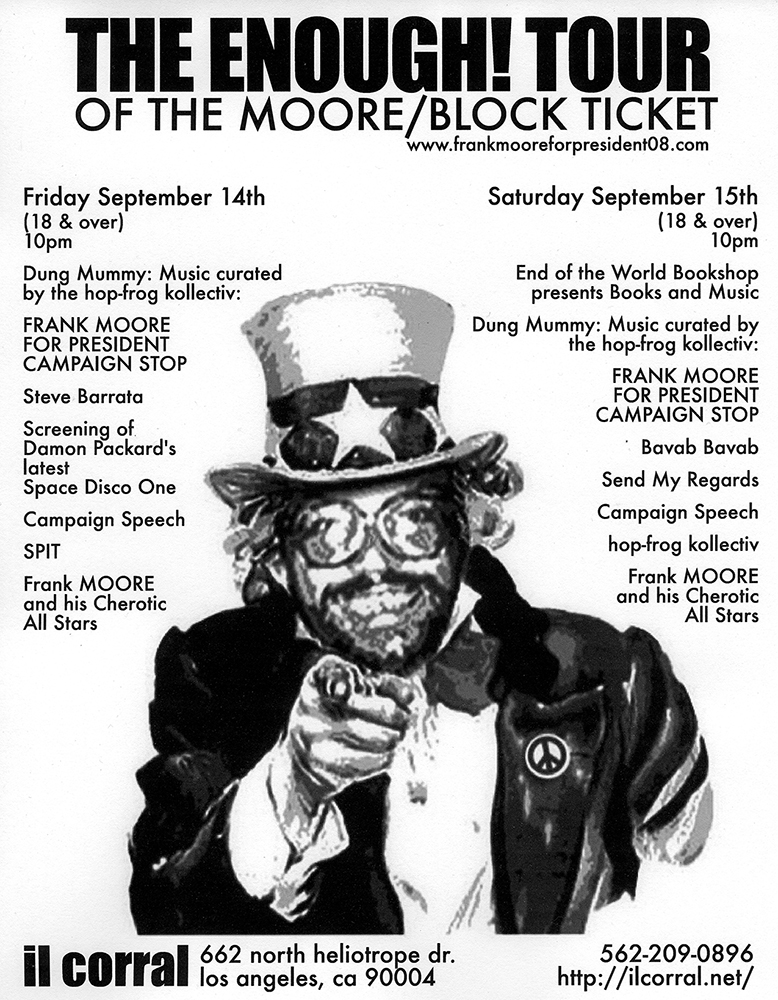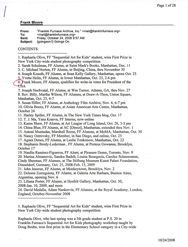 Frank Moore (1946–2013) was an artist, poet, painter, shaman, and teacher based in Berkeley, California. In 2008, and alongside running mate Susan Block, a sex educator and author, he mounted a campaign for president of the United States of America. A political novice who used a wheelchair and communicated primarily through a head-pointer, Moore intrinsically challenged norms of appearance, ability, and communication simply by way of showing up.
