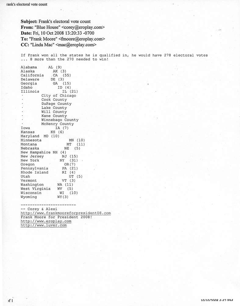 While Moore was primarily known—and somewhat infamous—for his performances exploring erotic and emotional connection, he stumped for a Berkeley-friendly platform not unlike that of Senator Bernie Sanders. Along with universal basic income, health care, and education, Moore was behind election day as a paid holiday, an end to the buying and selling of debt, and a feast of further reasonable positions. After considerable effort from Moore’s longtime collaborators, he and Block were official write-in candidates in 25 states, each with its own byzantine bureaucracy.
