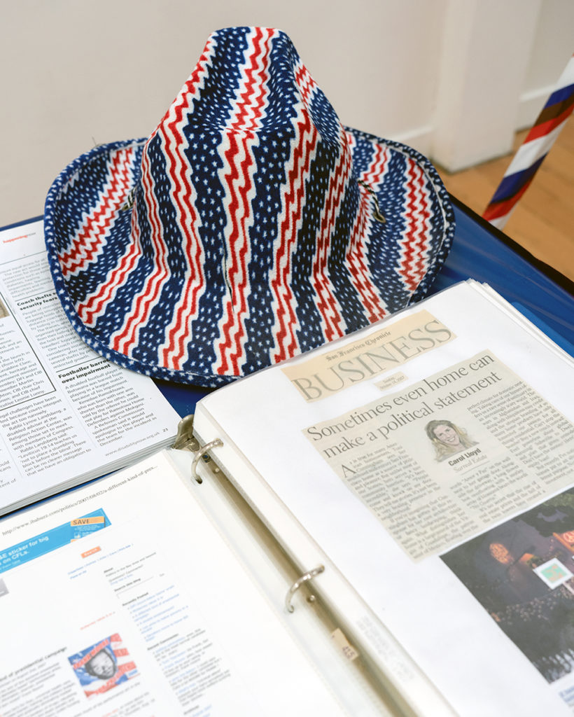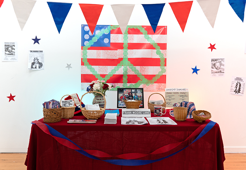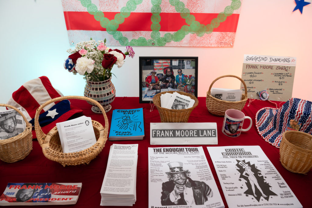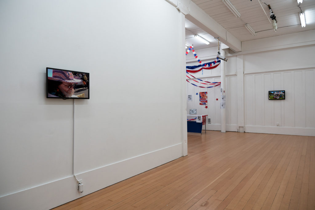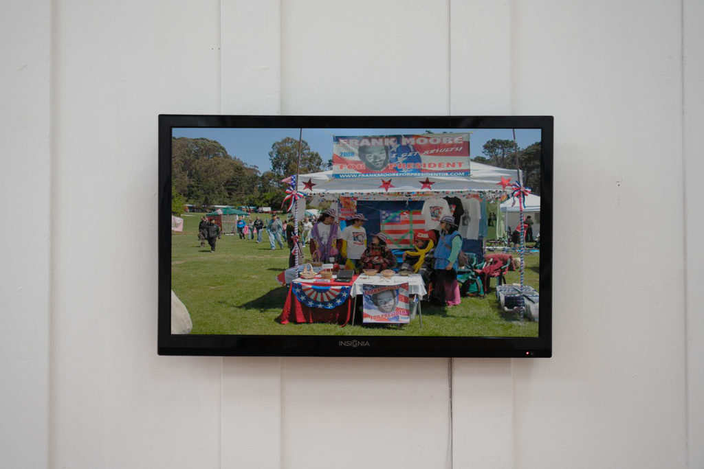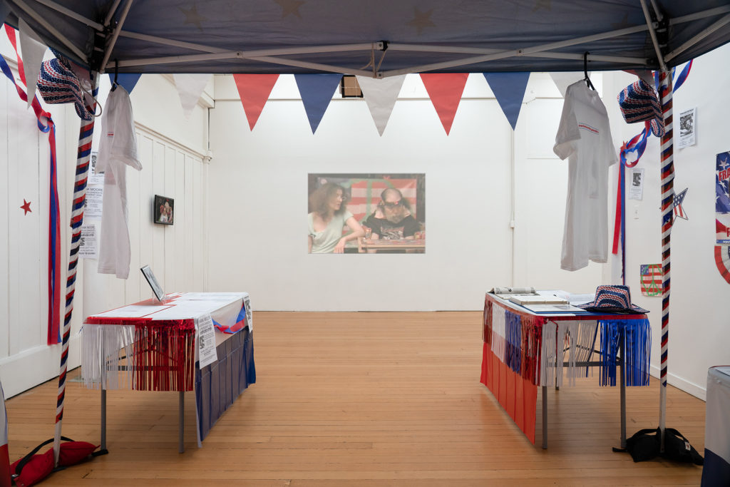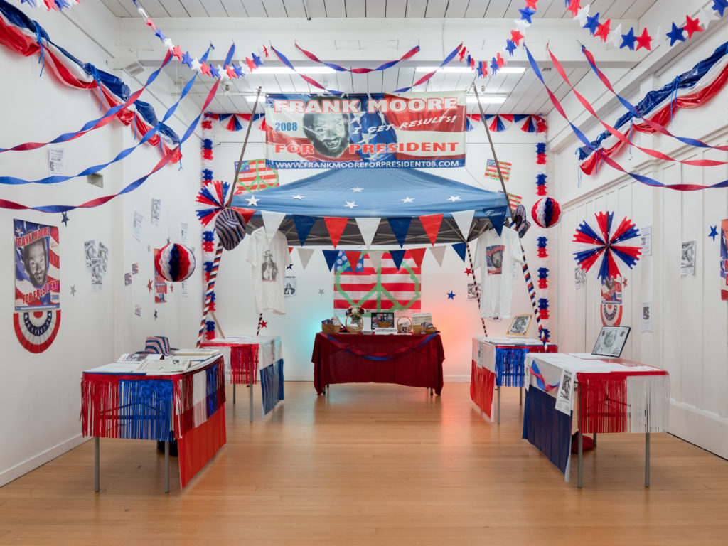 I Get Results! presents archival video footage, including public appearances and platform pronouncements, alongside official campaign documentation, press, and merchandise, all set within a patriotic installation modeled after the Moore/Block info-table assembled for events around the Bay. The exhibition opens on Inauguration Day, 2021, and remains on view for six weeks.