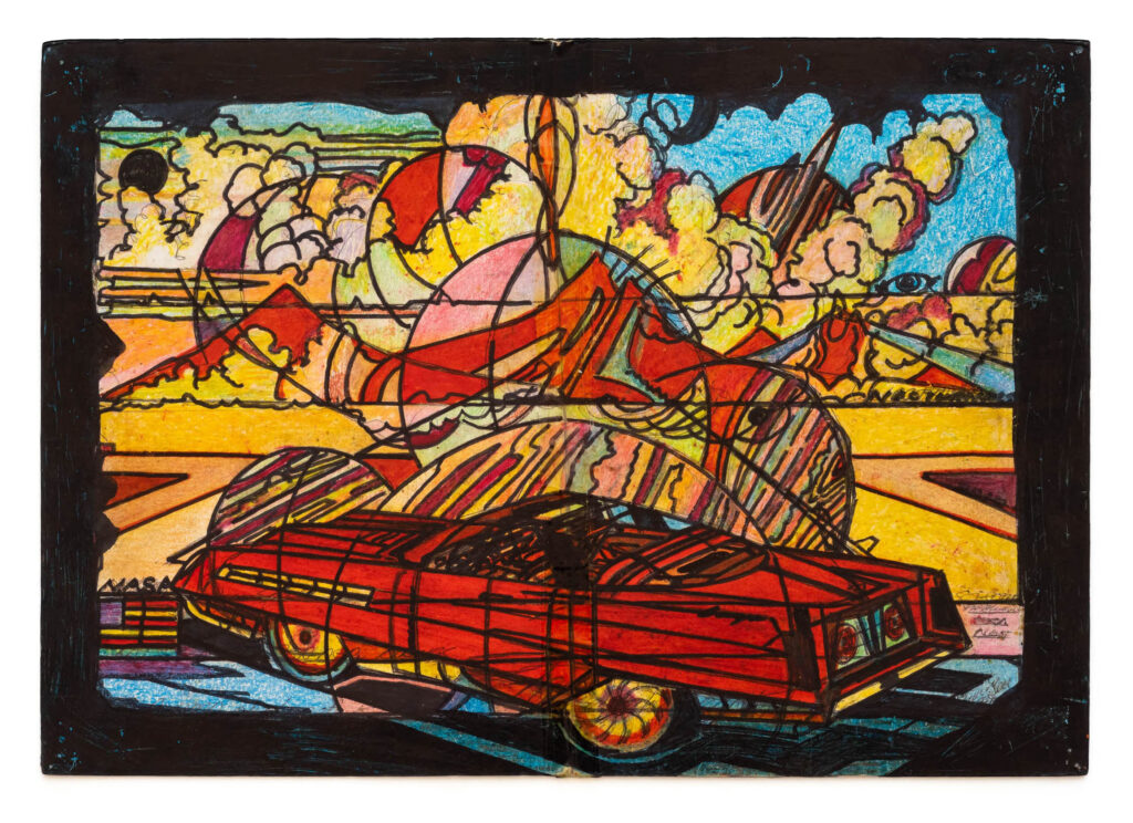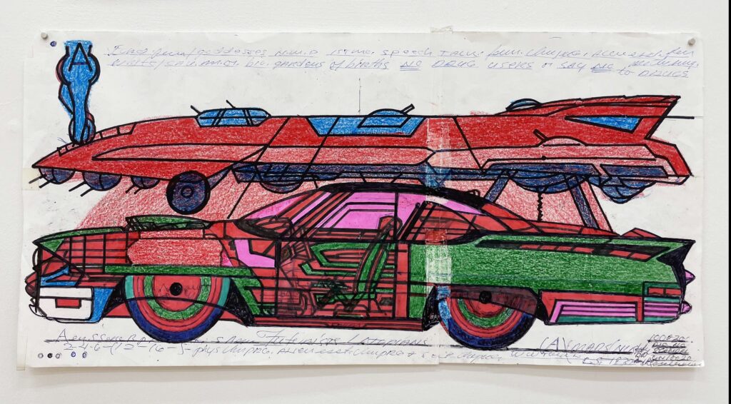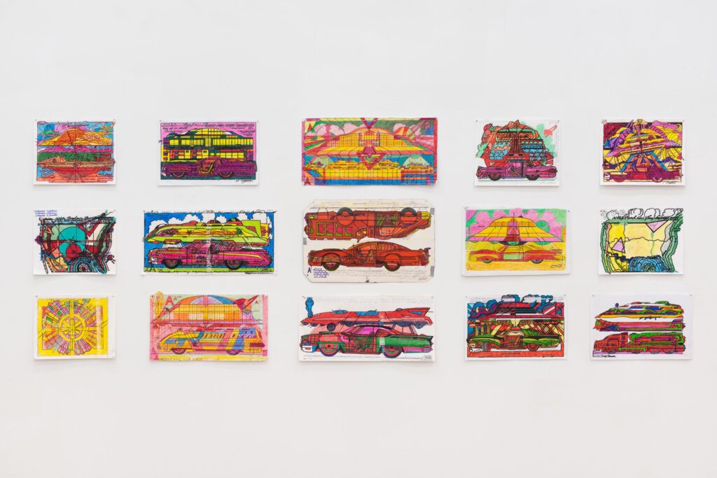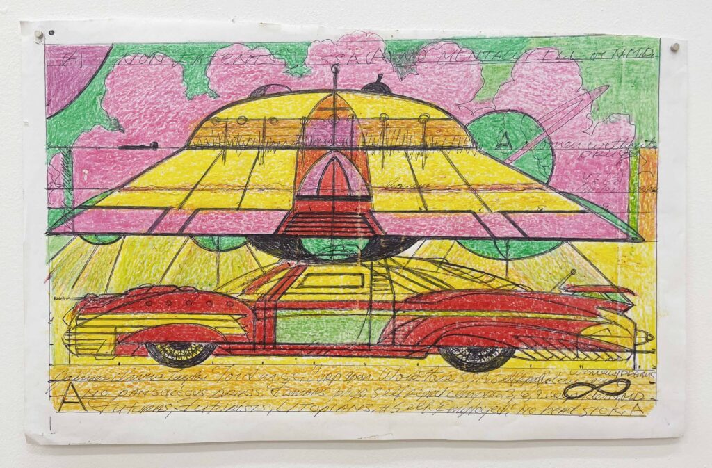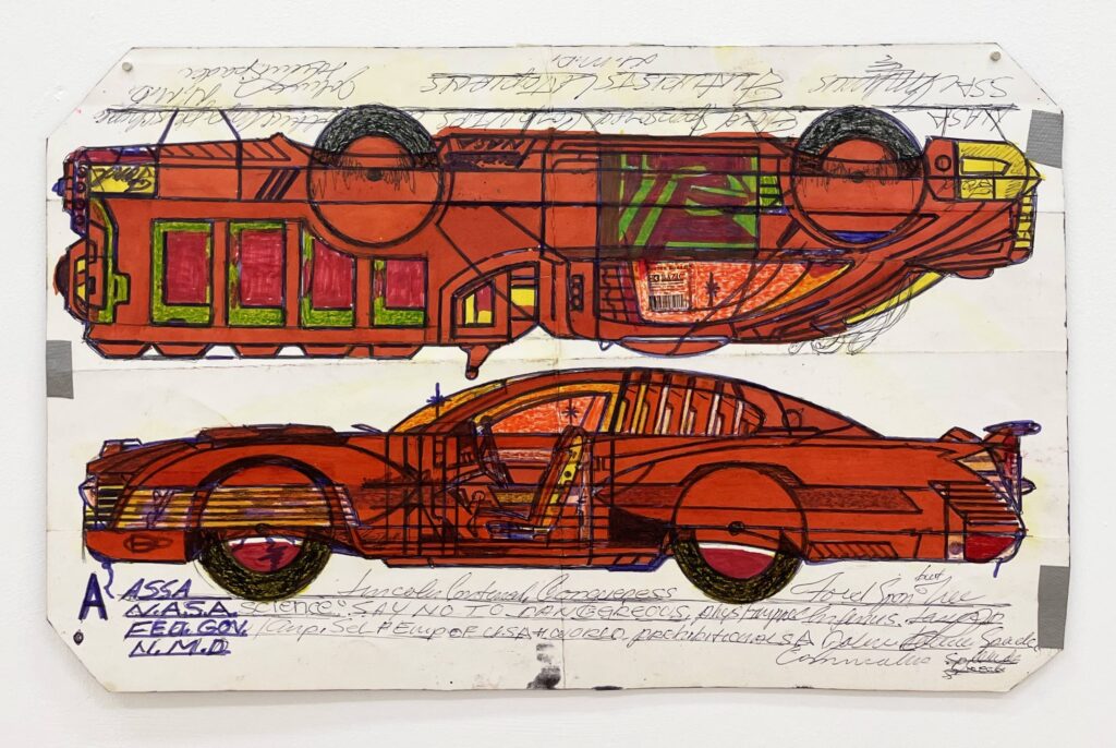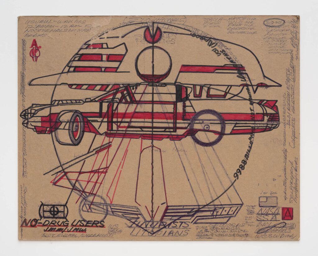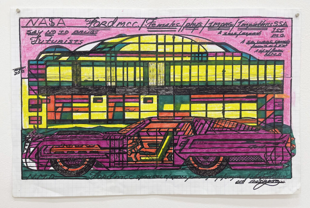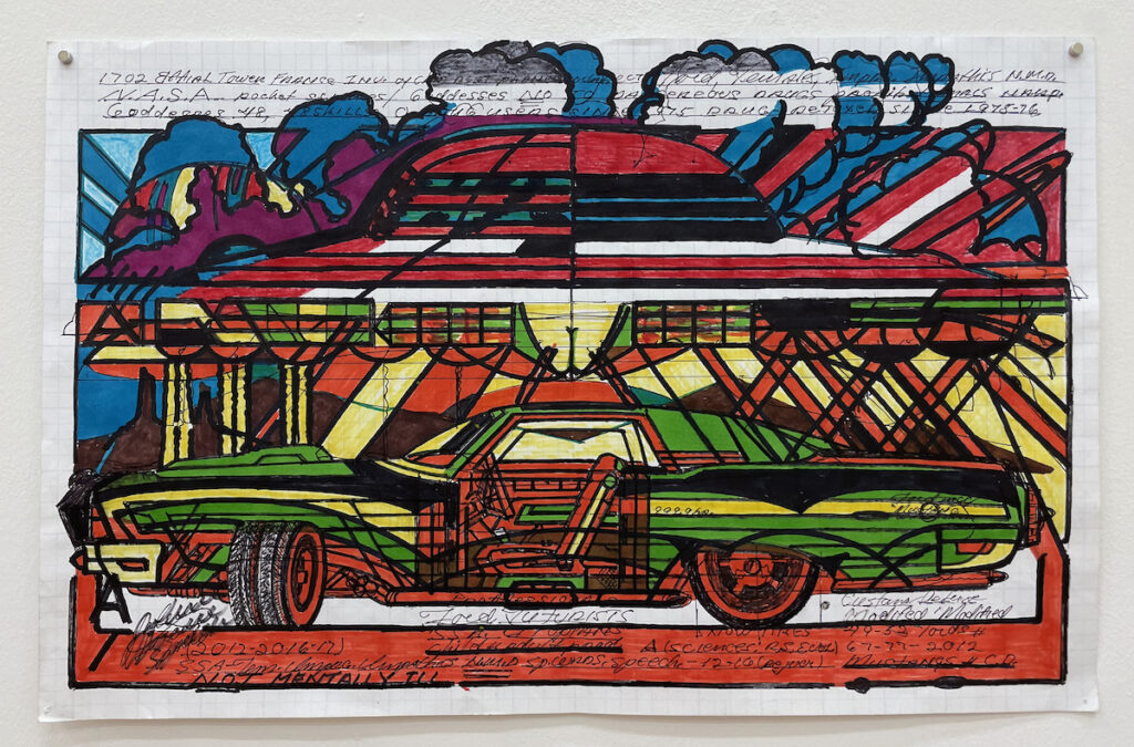 Cushion Works is pleased to present an exhibition of visionary artwork by James Irvine Taylor. From the heart of San Francisco’s Tenderloin, Taylor manifested an explosive array of signs, symbols, and schematics on paper, mostly populated by intricate automobiles against multi-colored, geometric landscapes. Taylor mapped an architecture just out of reach, and marked many of his works with the words “Futurists Utopians,” pairing the former’s yen for speed and transportation with the latter’s intentional withdrawal in search of the ideal. A network of corporate and clandestine entities, including Ford, NASA, the CIA, and FBI, populate the margins in the artist’s idiosyncratic script. Cushion Works presents a constellation of works on paper and foam core – some double-sided – and a series of notebooks, teeming and alive.