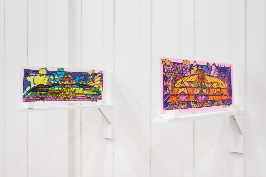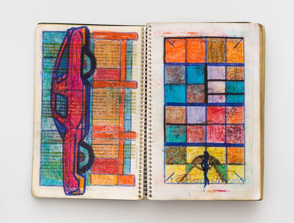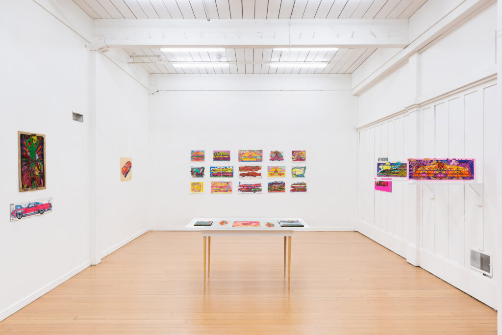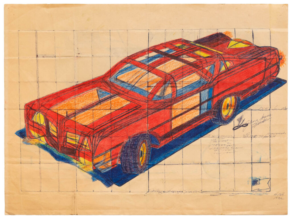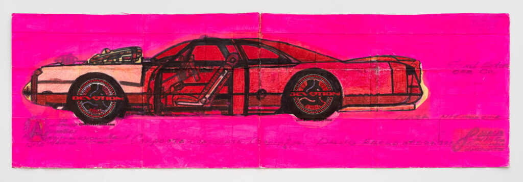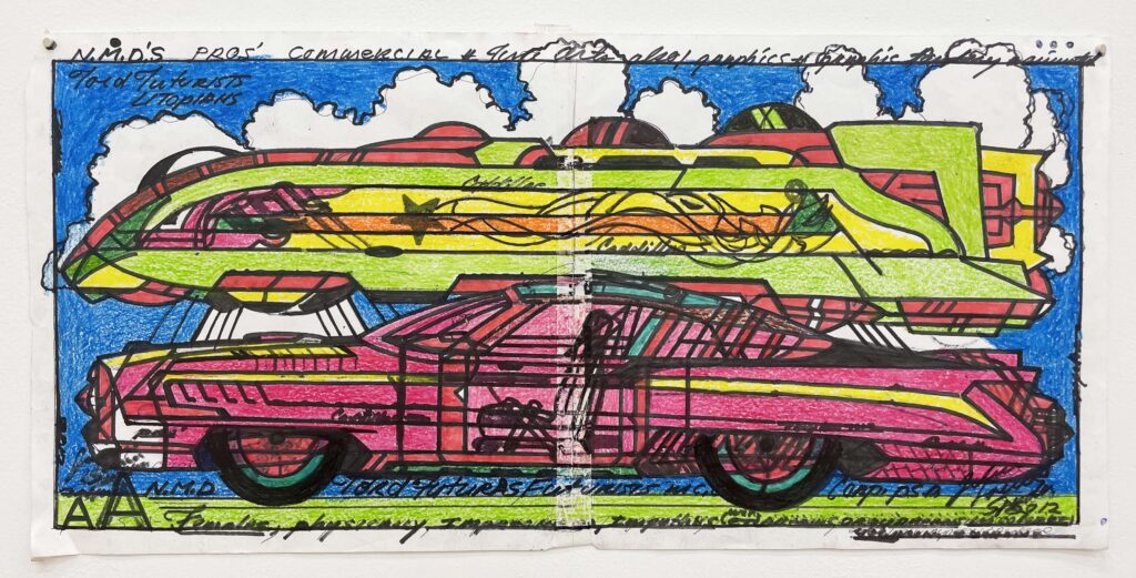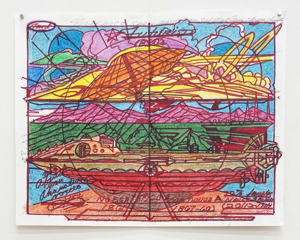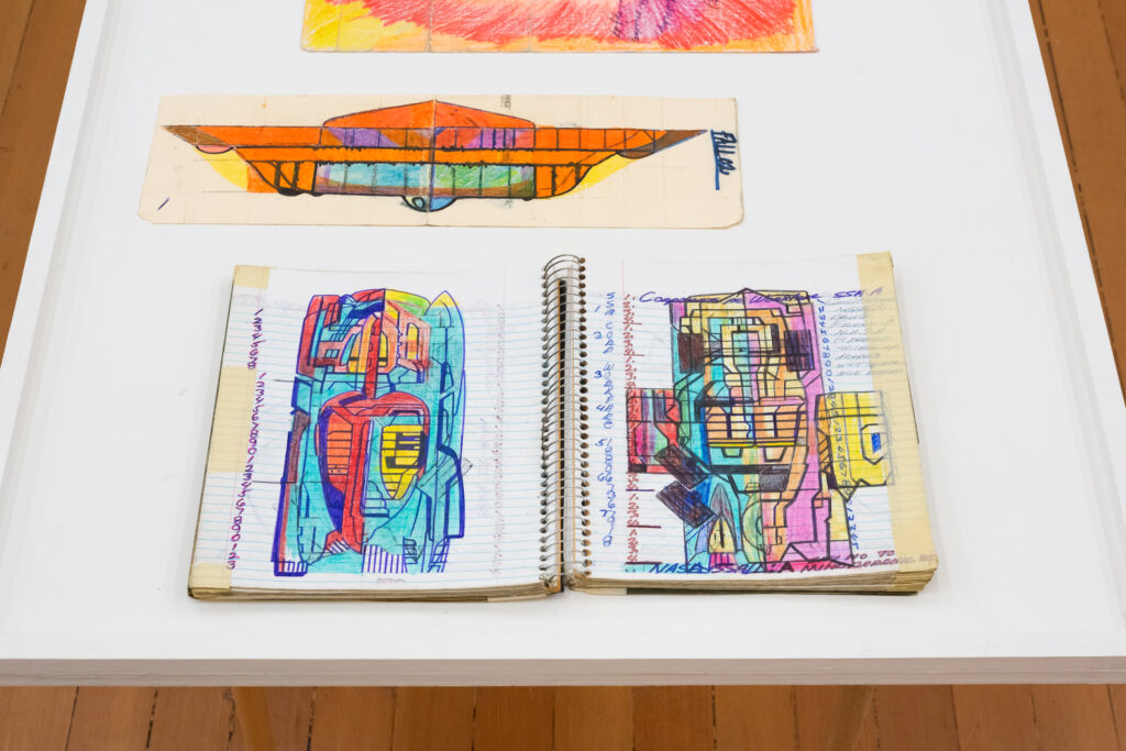 Cushion Works is pleased to present an exhibition of visionary artwork by James Irvine Taylor. From the heart of San Francisco’s Tenderloin, Taylor manifested an explosive array of signs, symbols, and schematics on paper, mostly populated by intricate automobiles against multi-colored, geometric landscapes. Taylor mapped an architecture just out of reach, and marked many of his works with the words “Futurists Utopians,” pairing the former’s yen for speed and transportation with the latter’s intentional withdrawal in search of the ideal. A network of corporate and clandestine entities, including Ford, NASA, the CIA, and FBI, populate the margins in the artist’s idiosyncratic script. Cushion Works presents a constellation of works on paper and foam core – some double-sided – and a series of notebooks, teeming and alive.