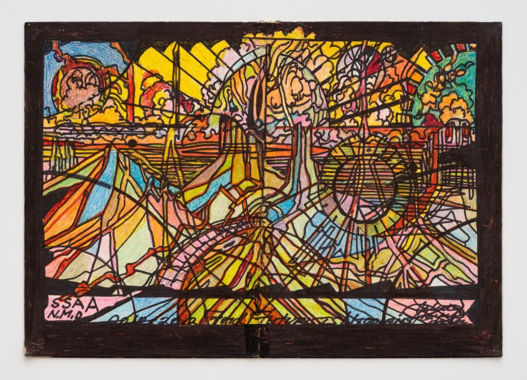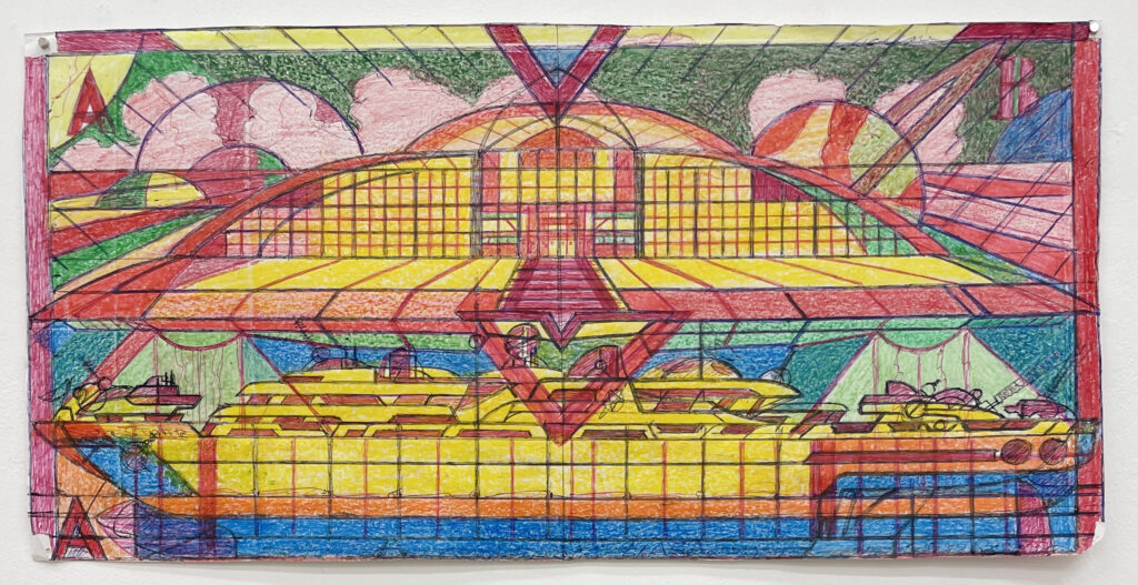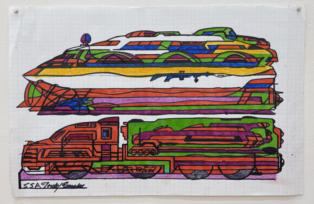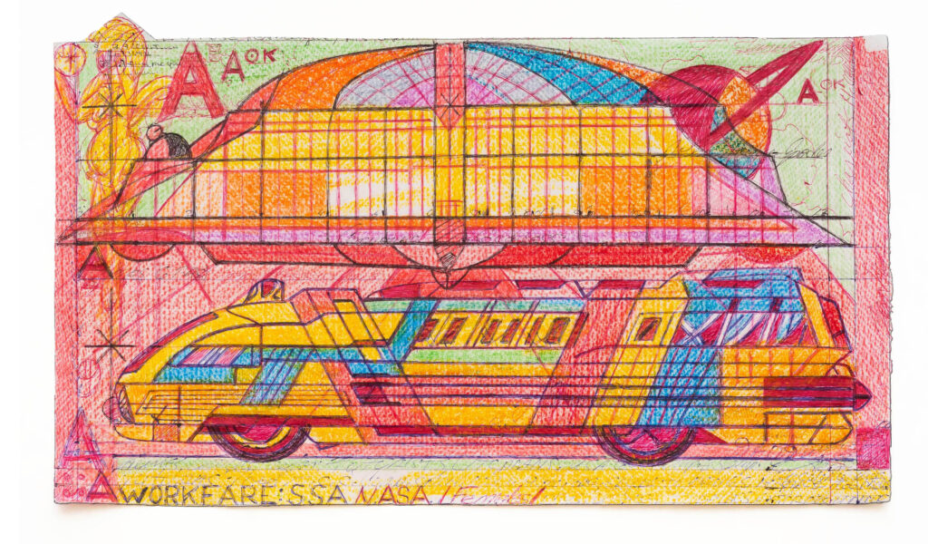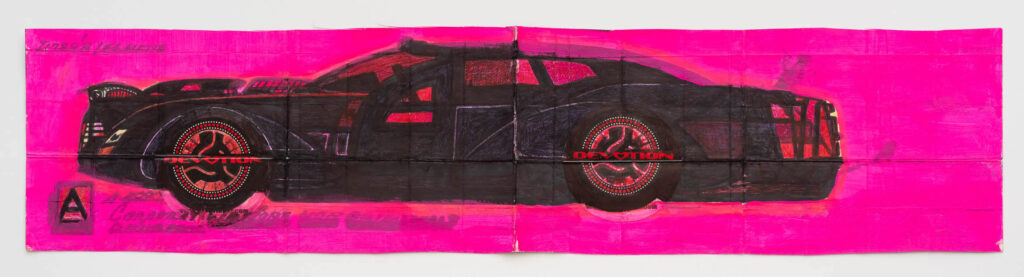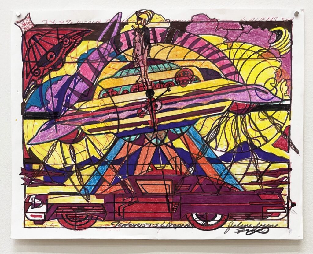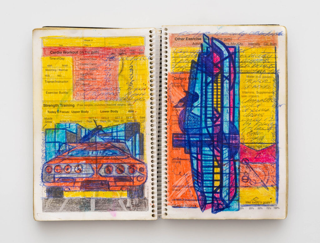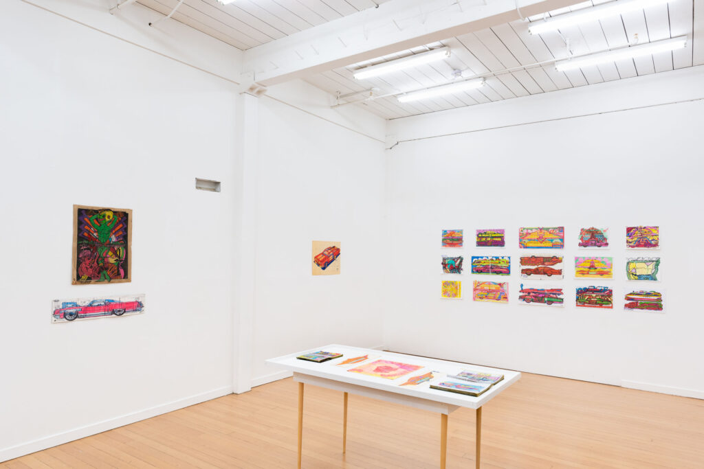 Cushion Works is pleased to present an exhibition of visionary artwork by James Irvine Taylor. From the heart of San Francisco’s Tenderloin, Taylor manifested an explosive array of signs, symbols, and schematics on paper, mostly populated by intricate automobiles against multi-colored, geometric landscapes. Taylor mapped an architecture just out of reach, and marked many of his works with the words “Futurists Utopians,” pairing the former’s yen for speed and transportation with the latter’s intentional withdrawal in search of the ideal. A network of corporate and clandestine entities, including Ford, NASA, the CIA, and FBI, populate the margins in the artist’s idiosyncratic script. Cushion Works presents a constellation of works on paper and foam core – some double-sided – and a series of notebooks, teeming and alive.