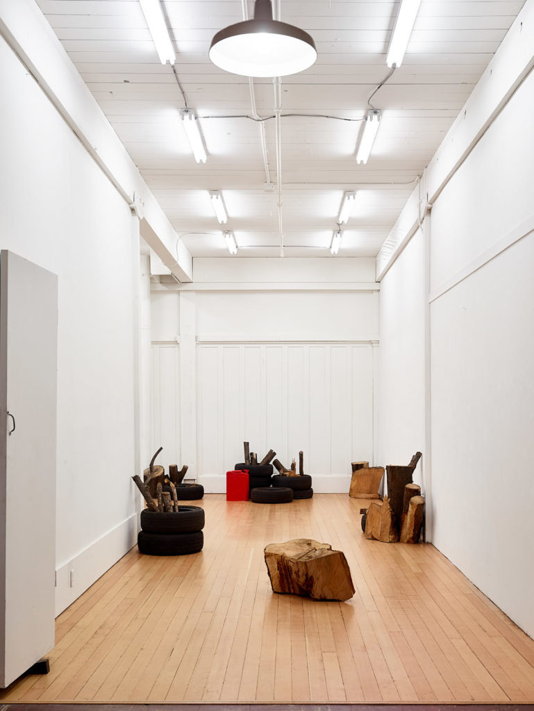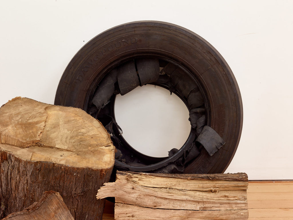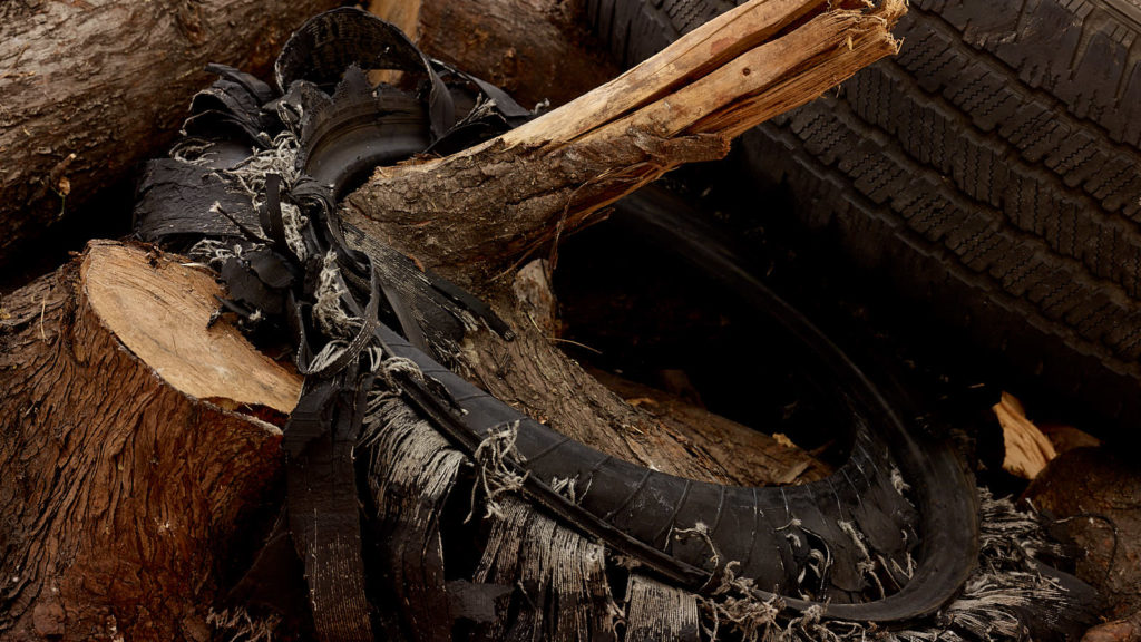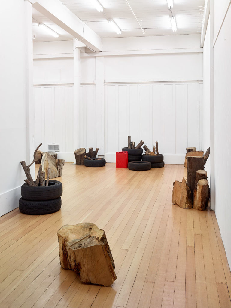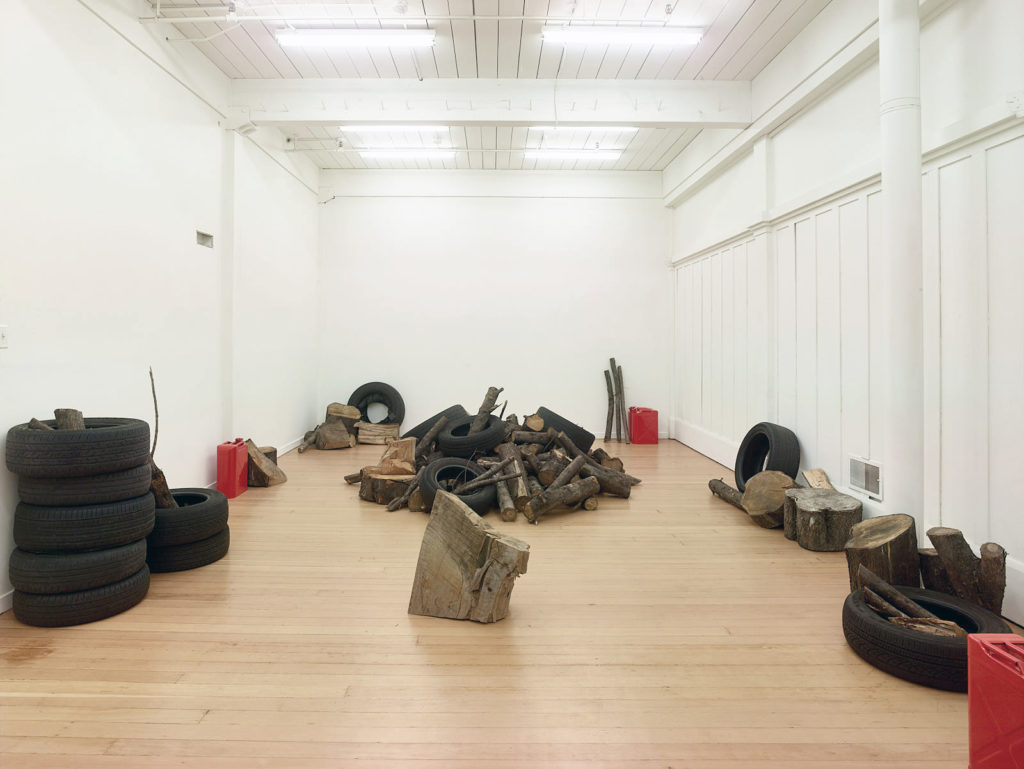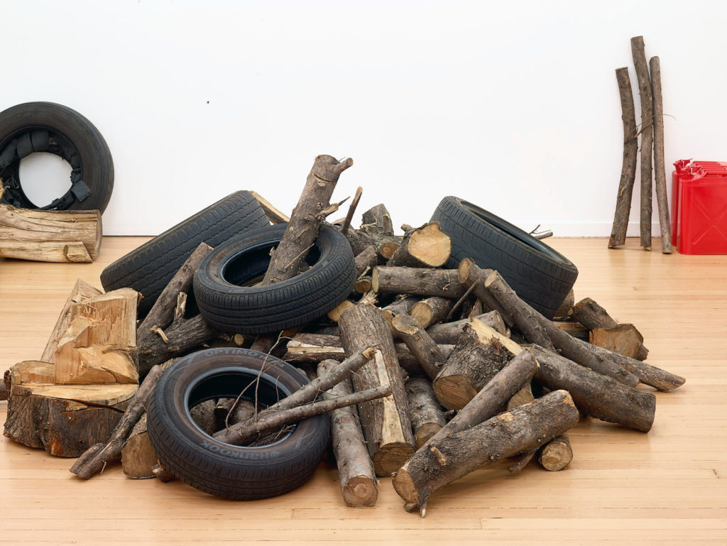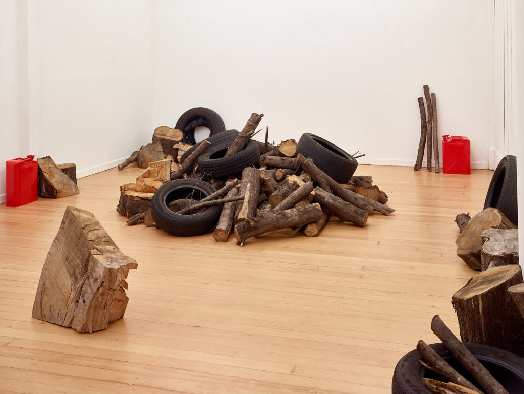 The work references mass disappearances at the hand of corrupt armed forces and paramilitary groups that have taken place in Mexico since the 1960s and significantly escalated over the last decade due to the War on Drugs. While the piece may be installed any number of ways, it is marked by the precision of its material content: 71 liters of gasoline, 23 used car tires, and 760 kilograms of wood. These figures—the amount of matter necessary to incinerate a single human body—are based on the findings of independent forensic teams deployed in response to the implausibility of various official government explanations.