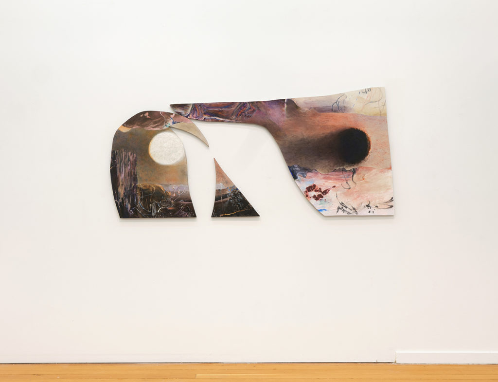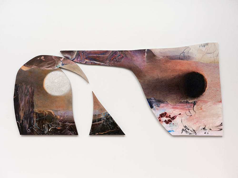 Second Hour, 2022, 75 x 38″, ink, oil, acrylic, sand, canvas, engraved aluminum. [Wall-mounted artwork in three shaped panels.]