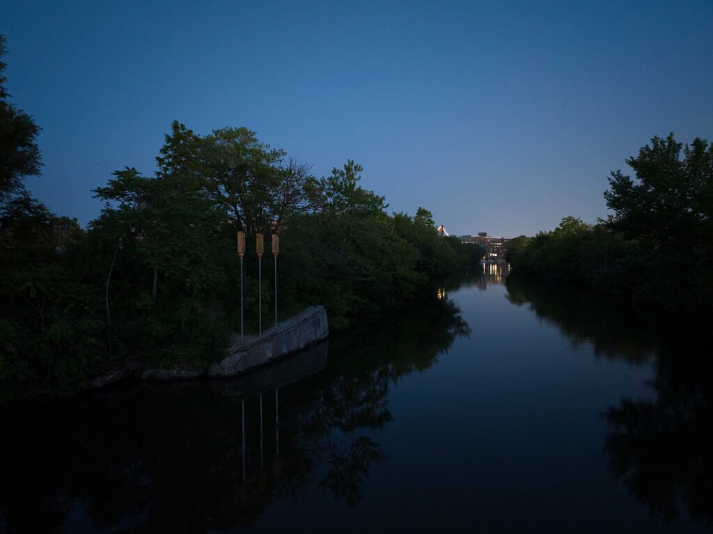 Three bat houses constructed and installed along Bubbly Creek by artist Nick Raffel aim to provide shelter for bats to roost and raise their young. The dual chamber units are designed by the Human-Wildlife Interactions Lab at the University of Illinois and widely used in conservation efforts. Bats dwell shoulder to shoulder inside; their thermal energy heats the space.