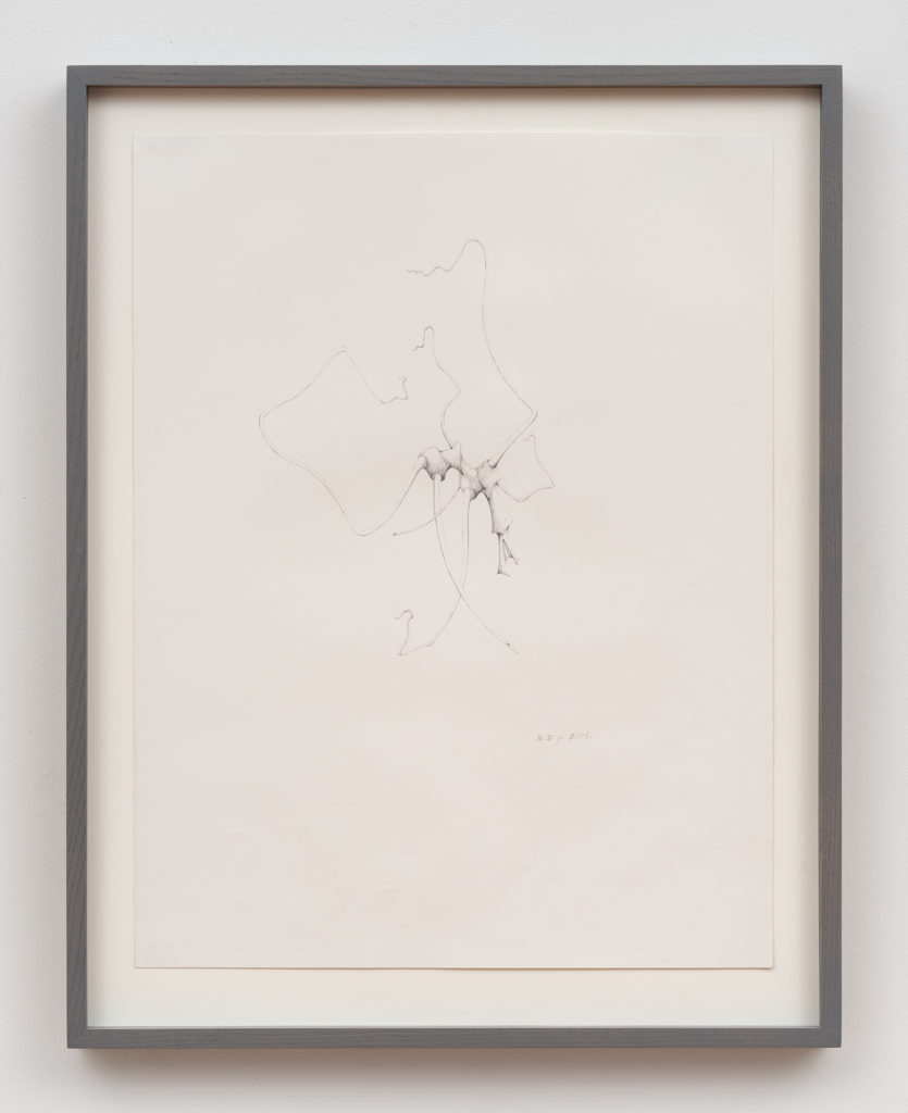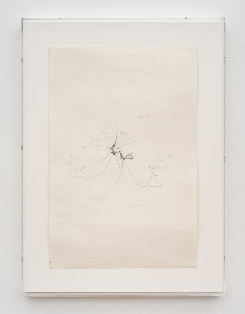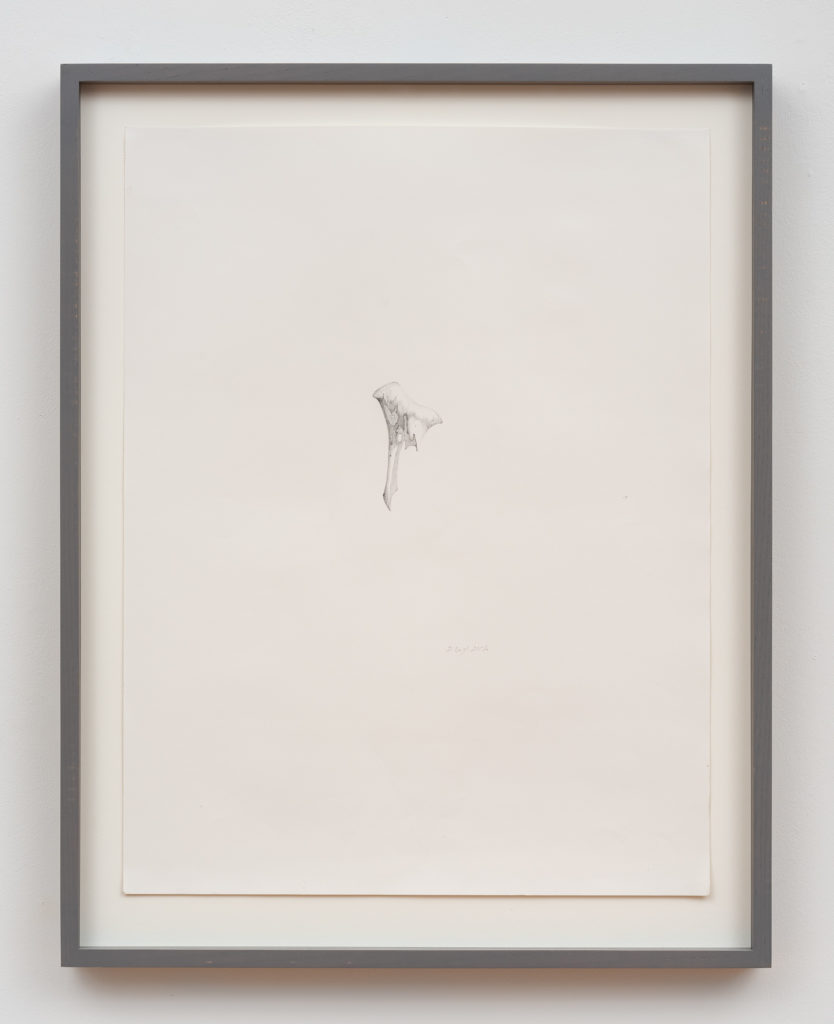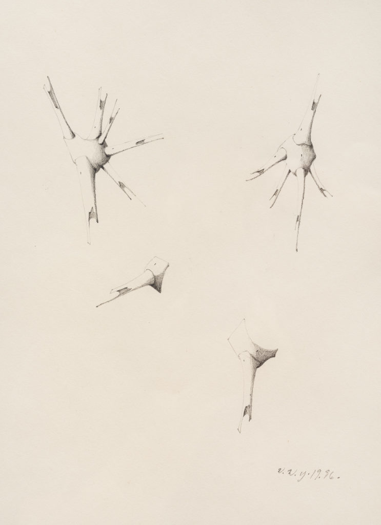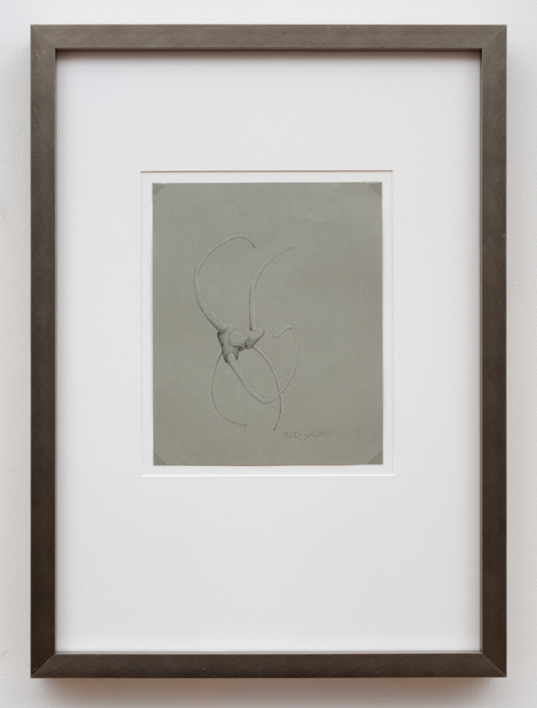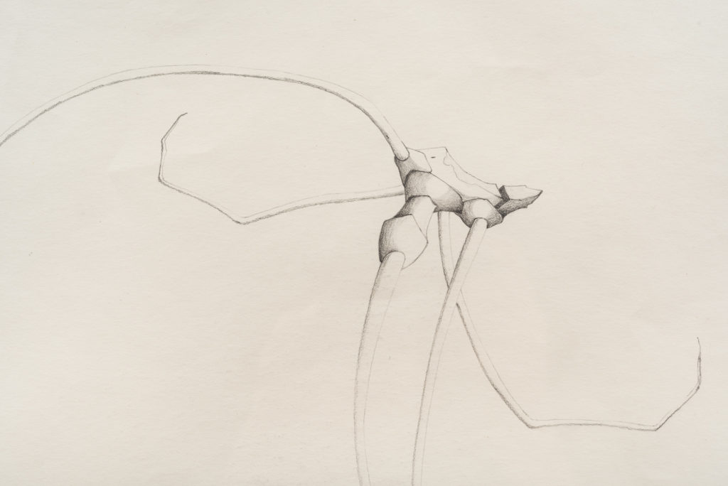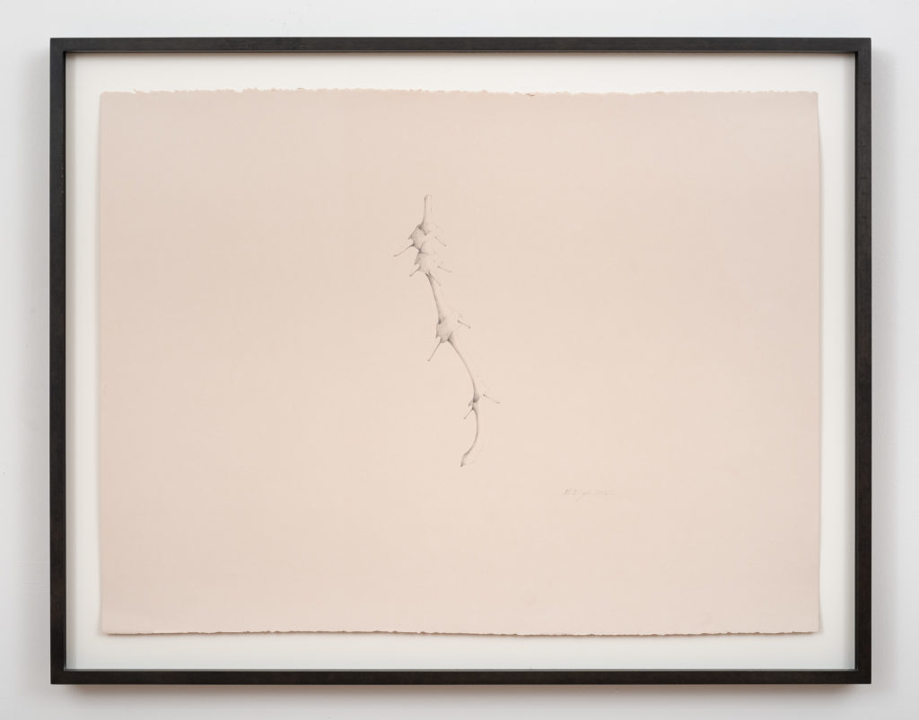 Young’s strange and delicate drawings resemble perceivable artifacts of the natural world, like acorns, bones, and branches, alongside less visible phenomena, such as synaptic networks or nerve systems. Like an errant medical illustrator, Young employs a remarkable precision in bringing the objects at the center of his mind’s eye to life. Many works, in fact, are made with a pocketknife-sharpened pencil and the aid of a microscope. Throughout, his visions float in oceans of negative space.