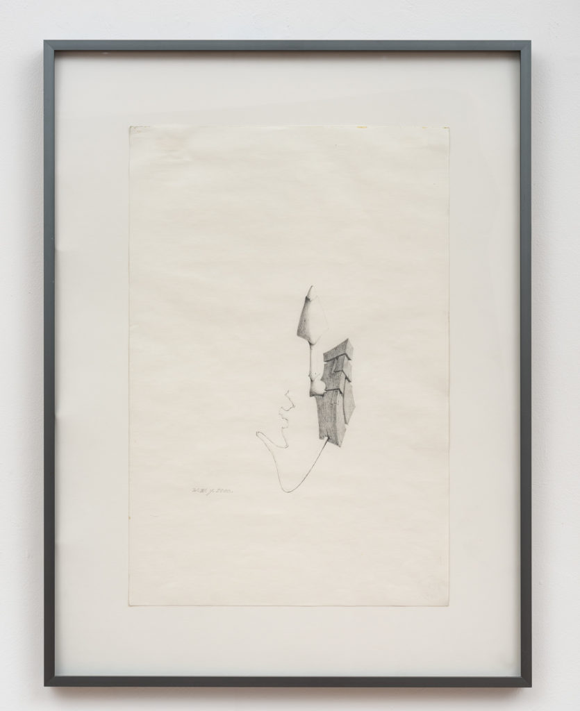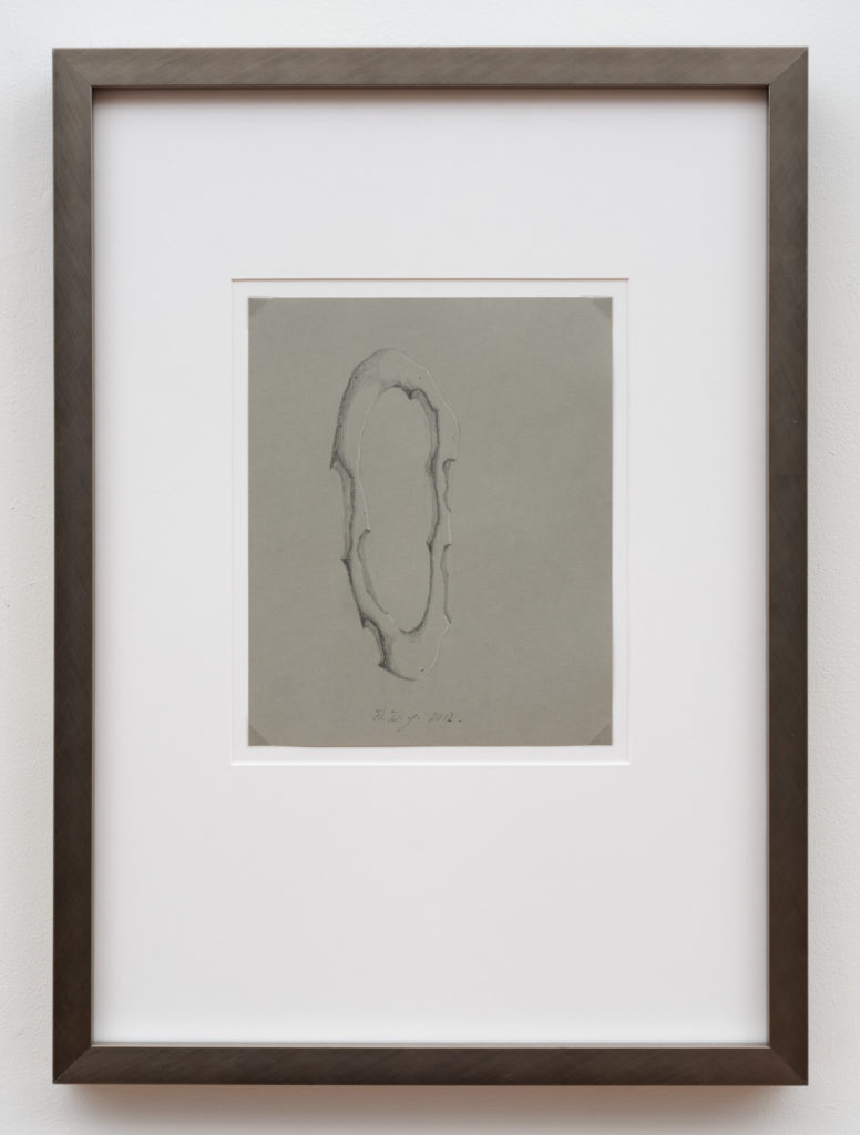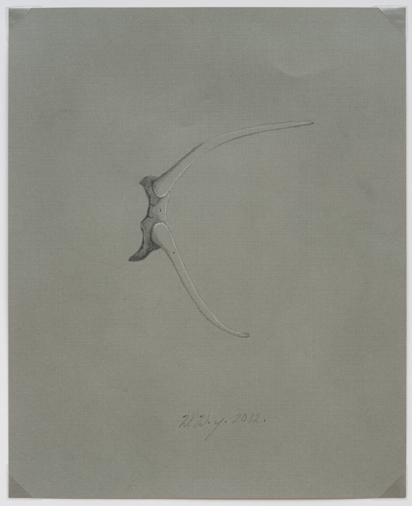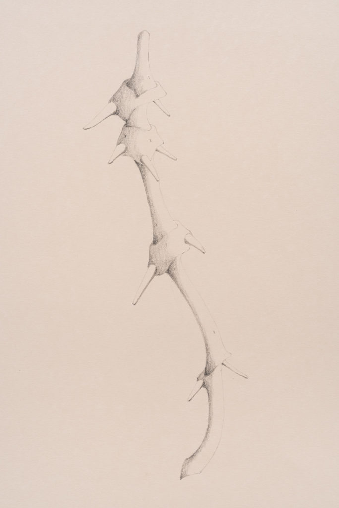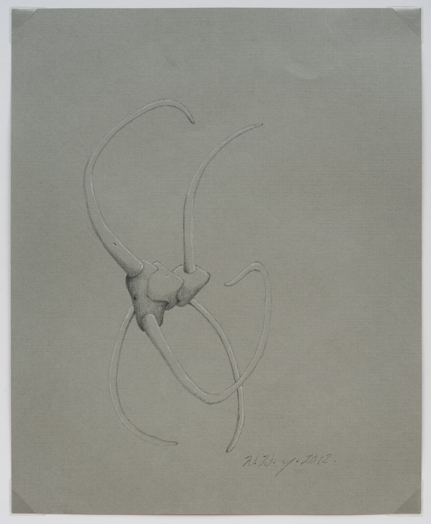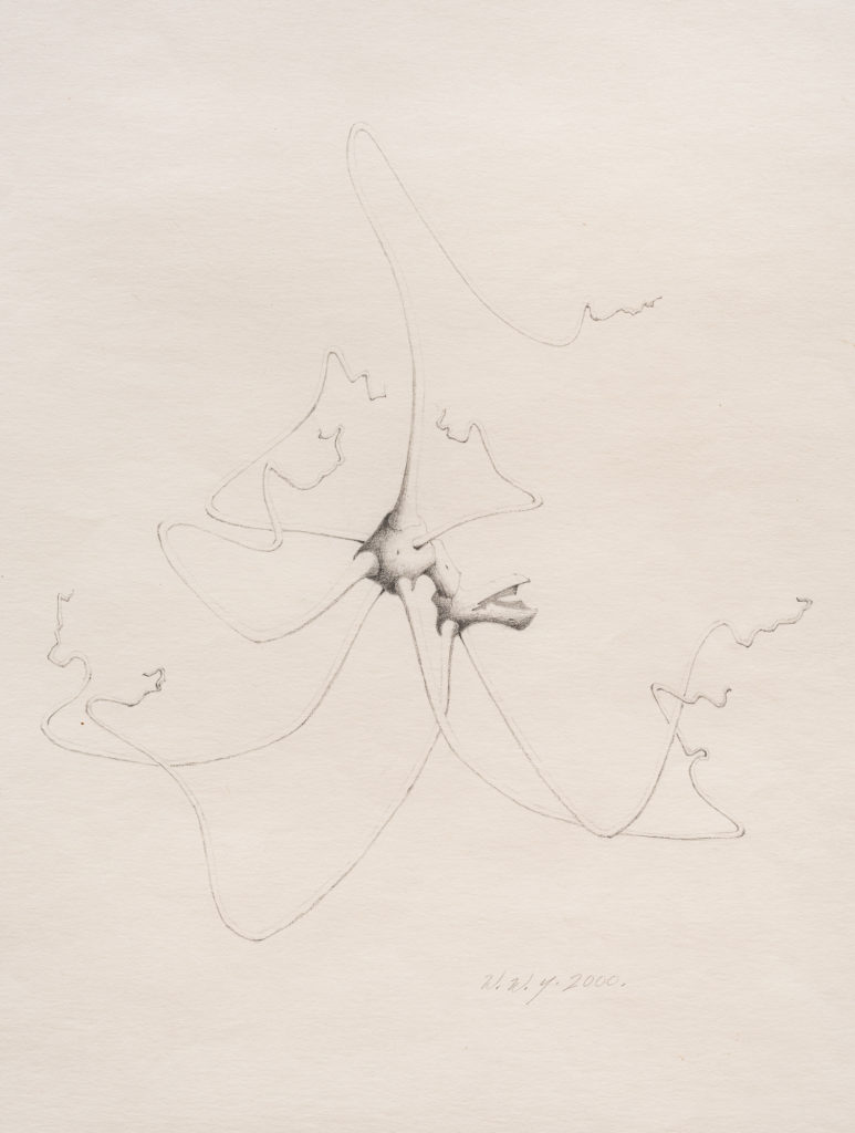 Young’s strange and delicate drawings resemble perceivable artifacts of the natural world, like acorns, bones, and branches, alongside less visible phenomena, such as synaptic networks or nerve systems. Like an errant medical illustrator, Young employs a remarkable precision in bringing the objects at the center of his mind’s eye to life. Many works, in fact, are made with a pocketknife-sharpened pencil and the aid of a microscope. Throughout, his visions float in oceans of negative space.