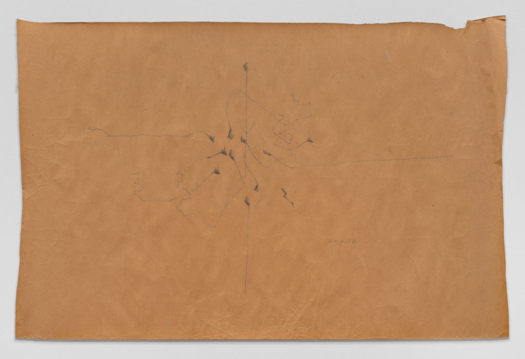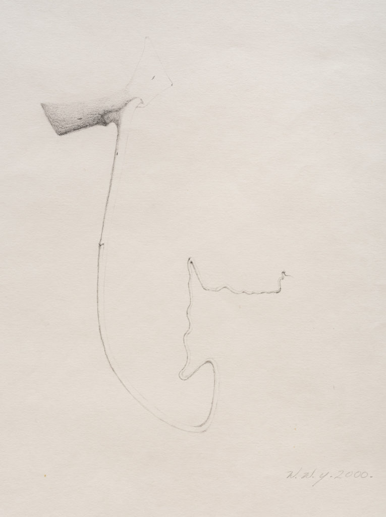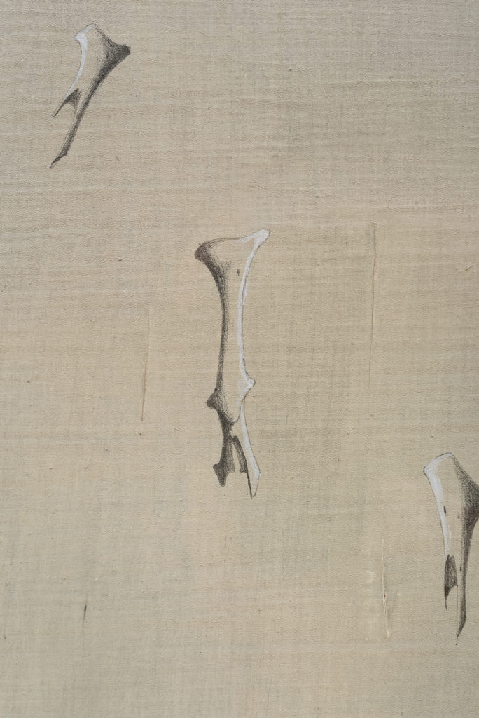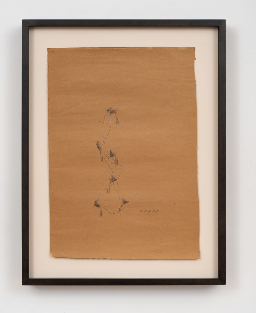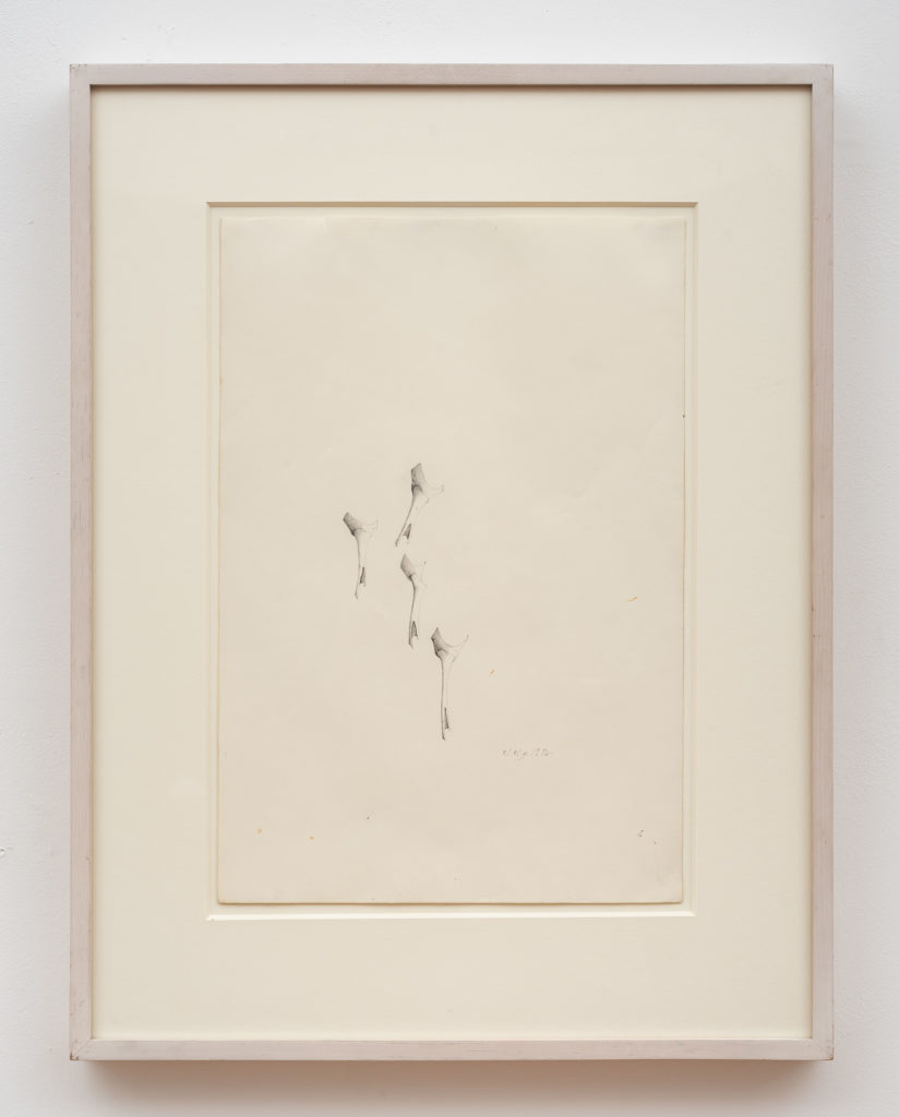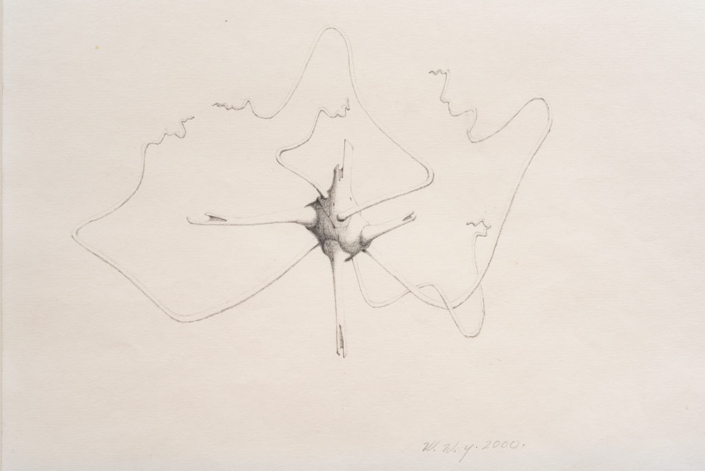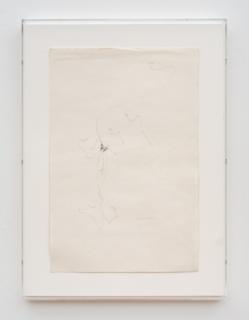 Young’s strange and delicate drawings resemble perceivable artifacts of the natural world, like acorns, bones, and branches, alongside less visible phenomena, such as synaptic networks or nerve systems. Like an errant medical illustrator, Young employs a remarkable precision in bringing the objects at the center of his mind’s eye to life. Many works, in fact, are made with a pocketknife-sharpened pencil and the aid of a microscope. Throughout, his visions float in oceans of negative space.